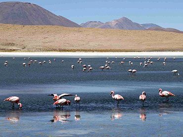 ![]() | Day 12: Salar de Uyuni tour - to Puerto Chuvica or Villa Candelaria (3,600 m) The first attraction of the day is Laguna Colorada, where flamingos can be seen in the warm season. The lake is rather shallow and has islets of borax and ice. The deep red color of the lake is caused by chlorine bacteria and deposits in the water. Further on you will pass through the Silolí Desert and see the famous Árbol de Piedra, a rock formation in the shape of a tree that was eroded. At Laguna Hedionda you can see flamingos, vicuñas and maybe even an Andean fox. Then you will pass the Ollagüe Volcano, from which smoke is constantly being released, and travel through the Salar de Chigüana to Puerto Chuvica or Villa Candelaria, where you will spend your last night. |