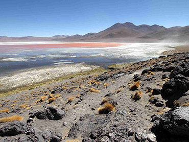 You drive into N.P. Avaroa at Laguna Colorada, the red lake. After a visit to this lake, the day ends in the nearby place Huallajara.